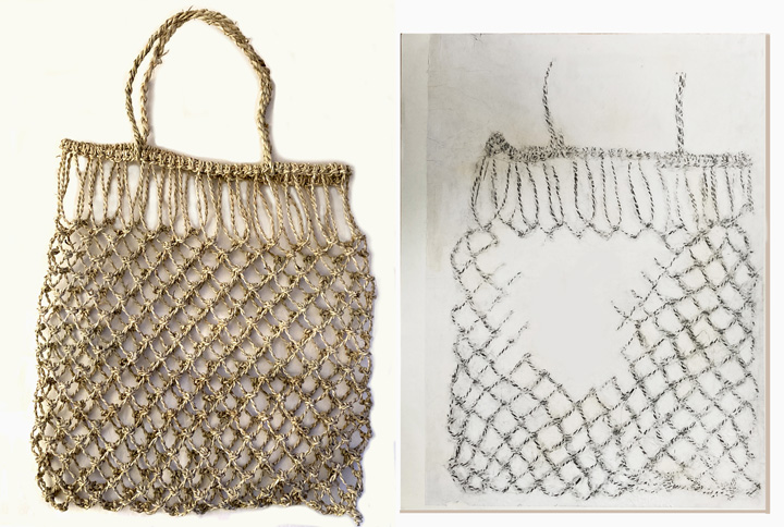 Atacama – duo 2025 Panier artisanal chilien et son redoublement en dessin, mine de plomb 70 x 110 cm Consécutif à un voyage d'étude au Chili dans le désert d'Atacama, témoigne des pratiques ancestrales ritualisées sur ce territoire.