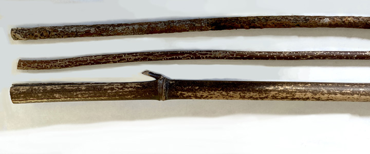 Le Temps 2025 Mimétisme Tige de métal, tige de bois, bambou Chaque élément mesure environ 1,20m Trois tiges de matière et d'âge différents jouent le mimétisme avec l'évolution naturelle de l'oxydation ou des altérations dues au facteur Temps.
